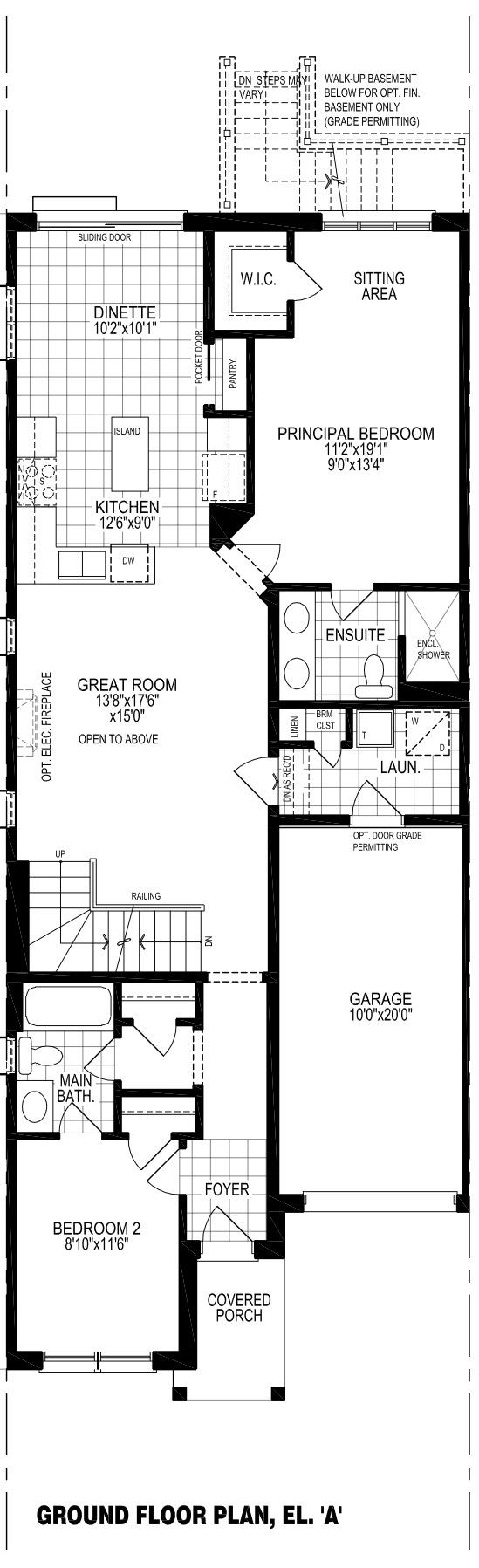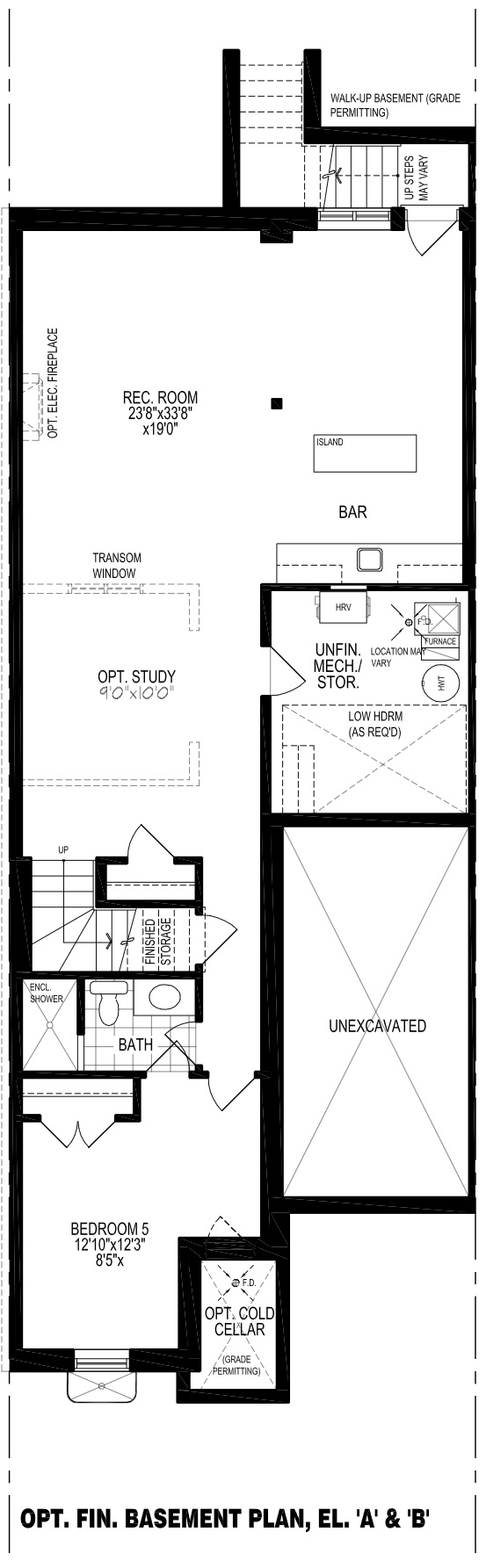 The optional finished basement plan allows for a fourth bedroom and bathroom, and a home office.